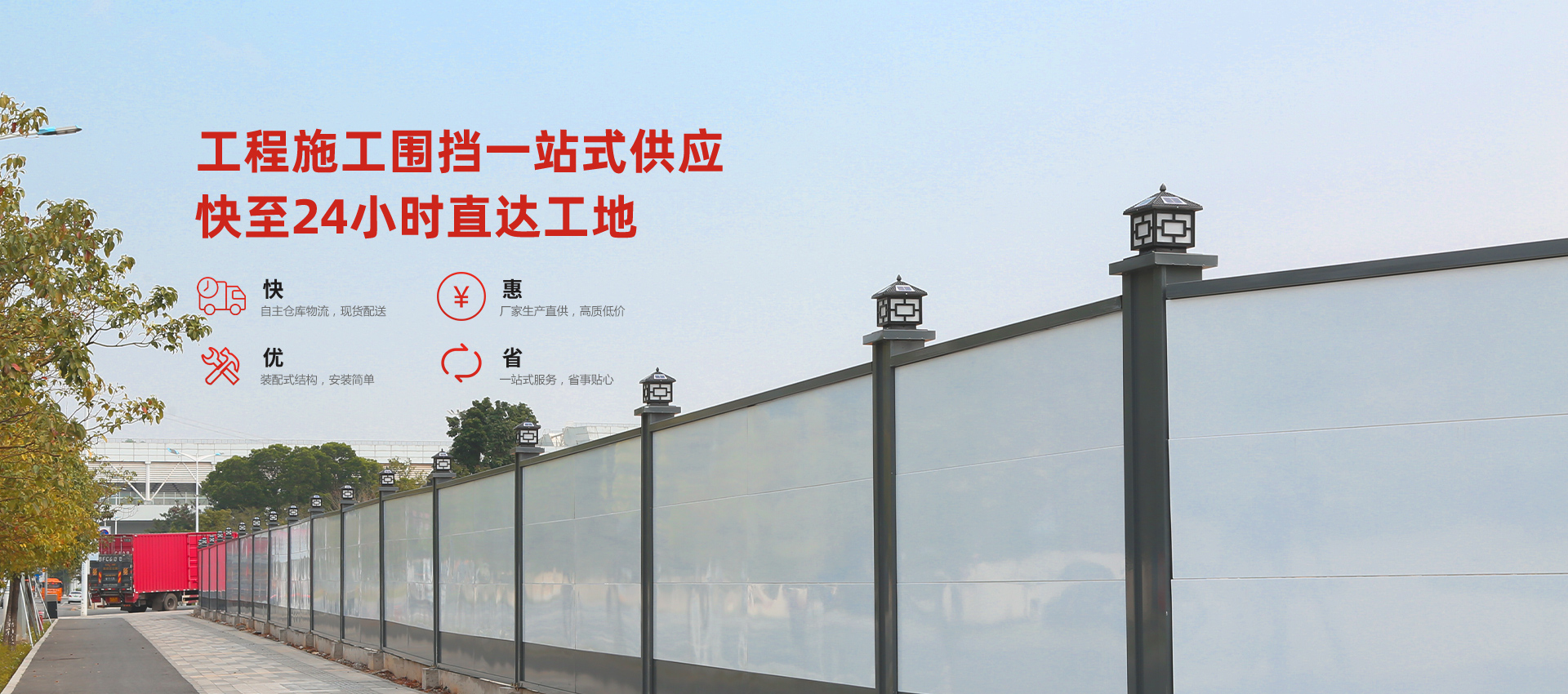 每種施工圍擋款式采用不同的現(xiàn)代美學視覺設(shè)計,立柱頂部或側(cè)面均可安裝各種造型美觀的路燈,墻體采用易保潔的圍擋專用材料,表面工地灰塵用清水沖洗即可,依然靚麗如新。
